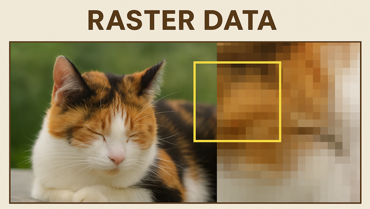 ラスターデータ…写真のように「小さな点(ピクセル)」の集まり。拡大するとギザギザ。