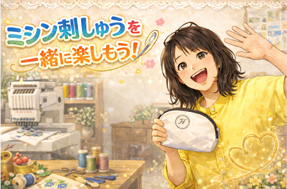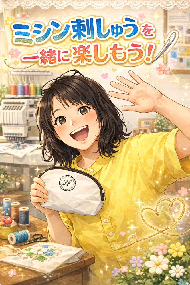 ミシン刺しゅうを一緒に楽しもう!っていう、ブログ用のサムネイルを上記の画像で作って。