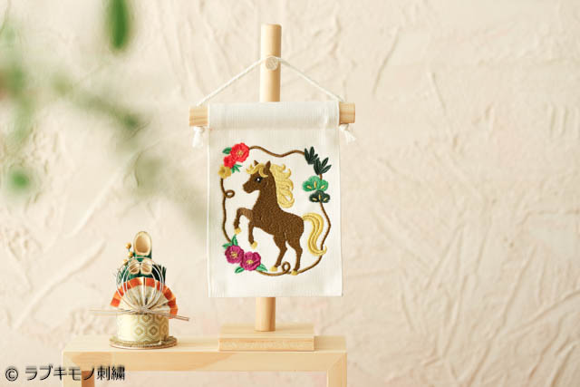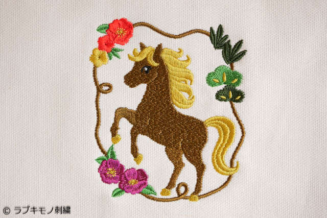 来年の干支「午」と、新春らしい花々を組み合わせた、縁起物の刺繍データです。
