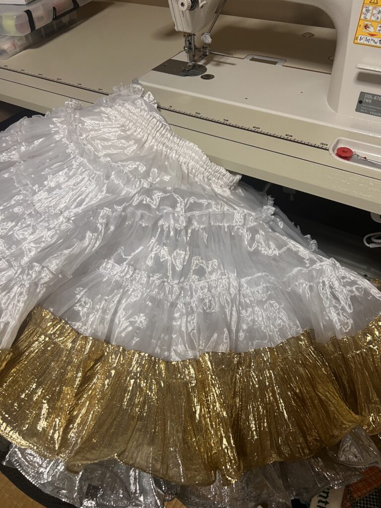 コスチュームの下には、パニエというものを履きますが、ダンスをするとくるくるまわったりするので、ウエストゴムが緩いと落ちてきてしまうんです。ゴムを入れ替えたのですが、きつくてお尻が入りませんでしたー😭