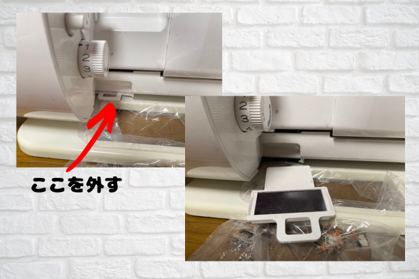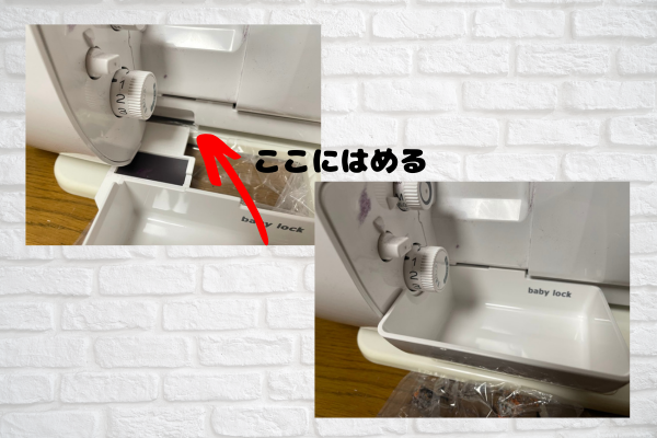 ➁トリムポケットの挿入部をミシン底部の左右の溝に合わせ、トリムポケットを挿入。