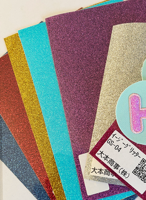 ライブの時に使っていた、広島の大本商事さんから頂いたサンプルの「イージーグリッターシート」(大阪ミシンショーにて)。