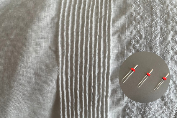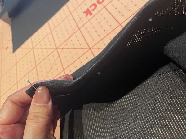 引いた線を山折りにつまみ待ち針で止め縫います。